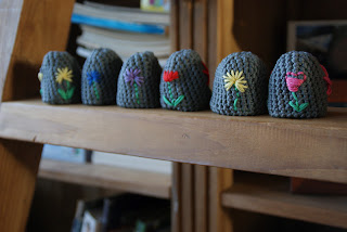 I found a lovely pattern for this egg cozy on craftgawker. I gave it a touch of my own by embroiding flowers on them. It will look lovely on the Easter table.